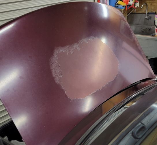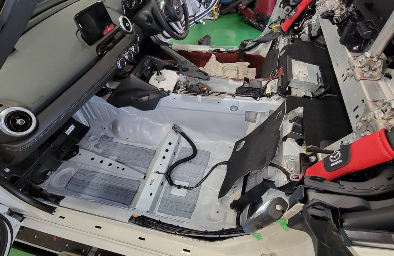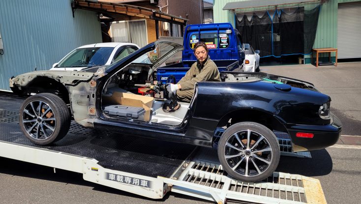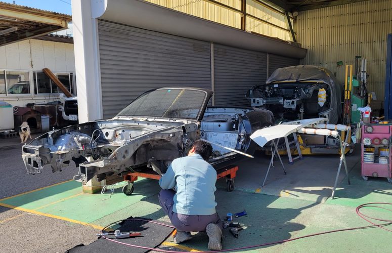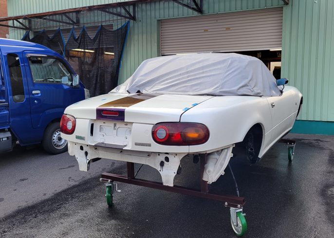 用事のついでに鈑金屋さんに。先日のドンガラに手を付けていました、切り離し作業中のようです。「最近こんな修理は無いよねぇ」とのこと。この後に後ろのNAも同じように切り離し作業が必要……恐ろしい手間ですよね。