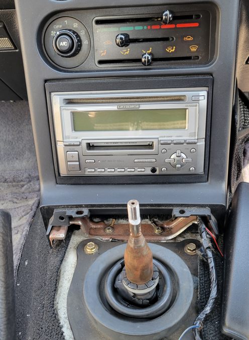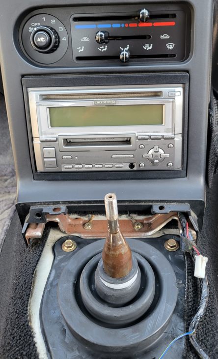 これは白いNAのクルマ、エアコンパネルの変色が進んでいるのでオーナーさんに打診。「特に気にならなかったけど」って……いやいや全然ちがうんよ! シフトブーツも破れて相当時間が経ってるよ……