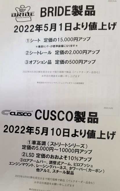 今日、問屋さんが来てこんなチラシを……サクラムさんも5月から値上げみたい、4月中の注文は今の価格かな?あまり煽るのは好きじゃないので書いてきませんでしたが……欲しい方は早めに動いた方が良いですね、もう時間無いけど!