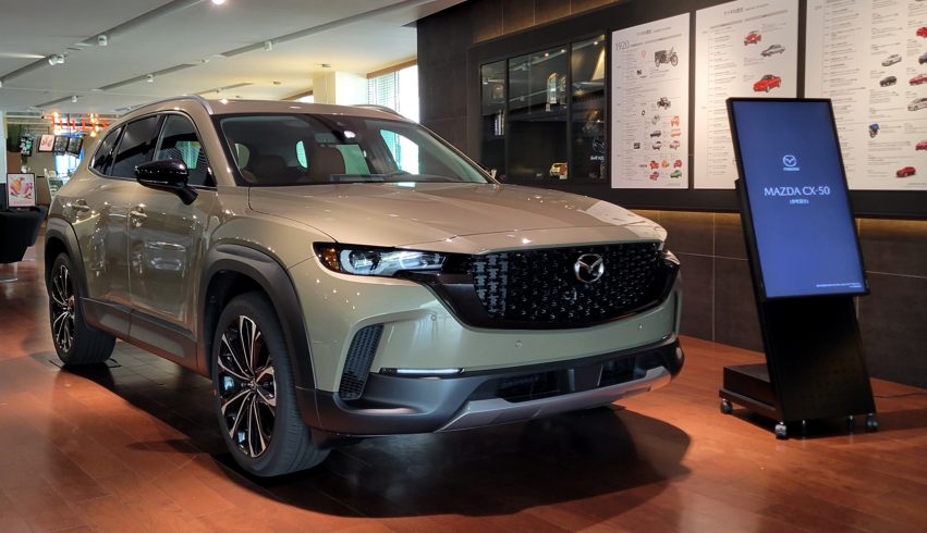 日本では売らないビックサイズなCX-50。迫力あるなぁ~ 車幅が1900超えてますからね!日本じゃちょっと売りにくいか? あ、ここはマツダ本社ロビーです。