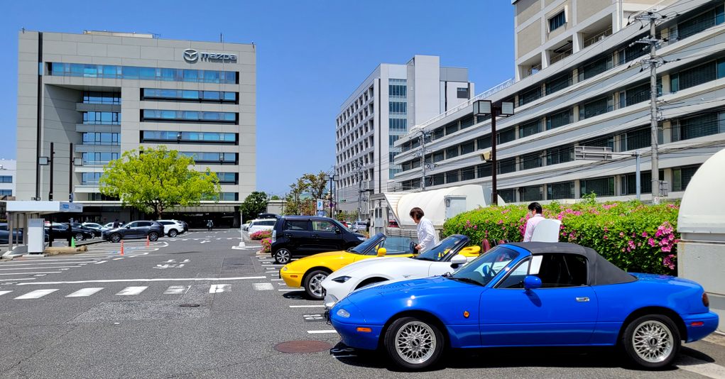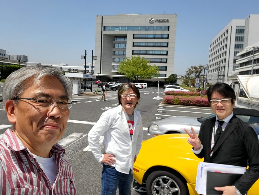 このクルマの向こうでは……ヤマグチさんとマツダの虫谷さんと若松さんが談笑中。虫谷さんが私を見て「どういうこと~」と笑います。そうなんです、以前ウチのガレージに来たことあるんですよ。