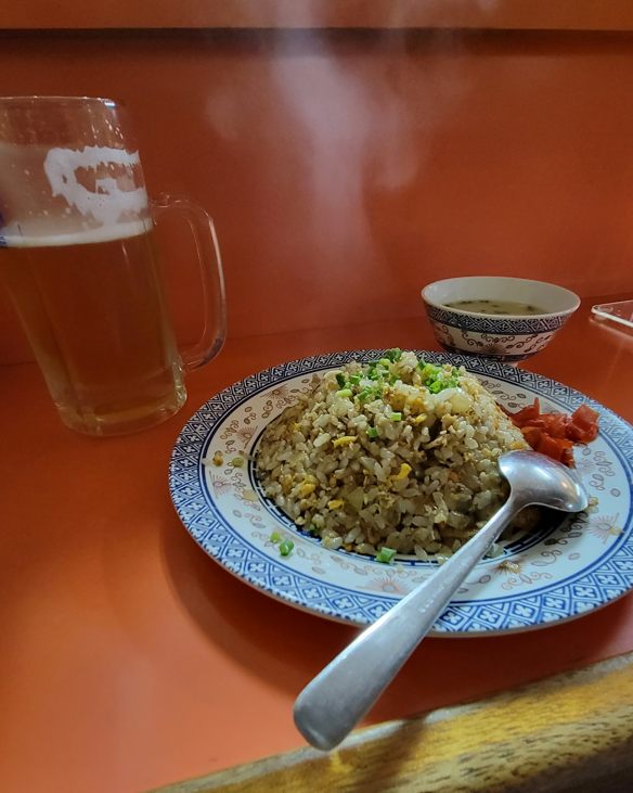 焼きめしとビール。お店の大将に「珍しい組み合わせですね」と。え?なんかオカシイの? ビール飲みながらゴハン食べるよ、お茶の代わりに。