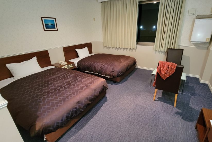 私の部屋です、シングルは先約があってダブルな部屋。 座るイスは1つ……TVはありません(そういうモンです)