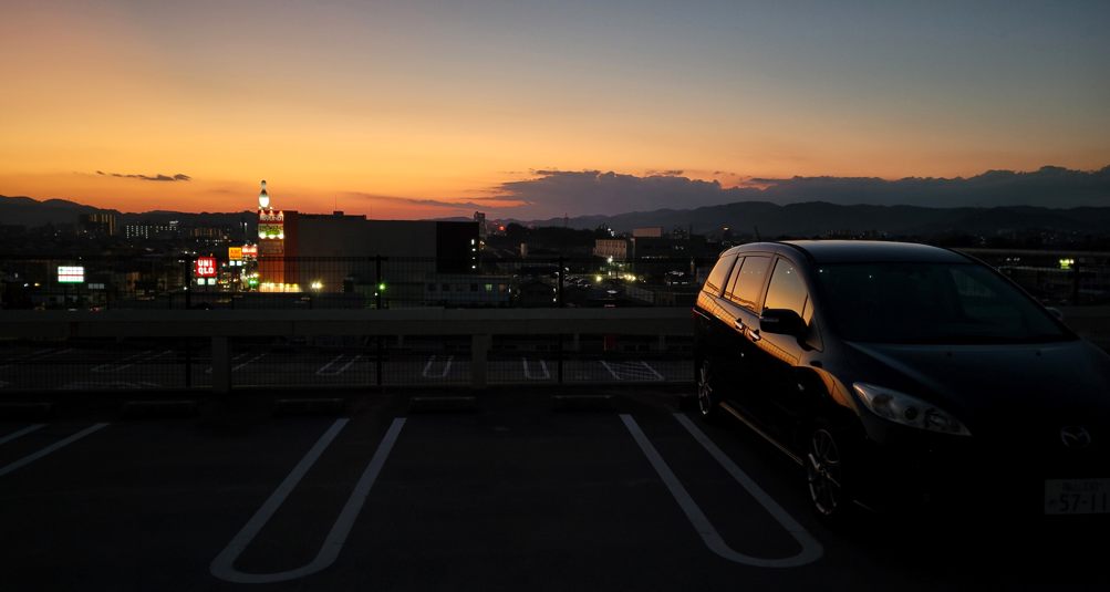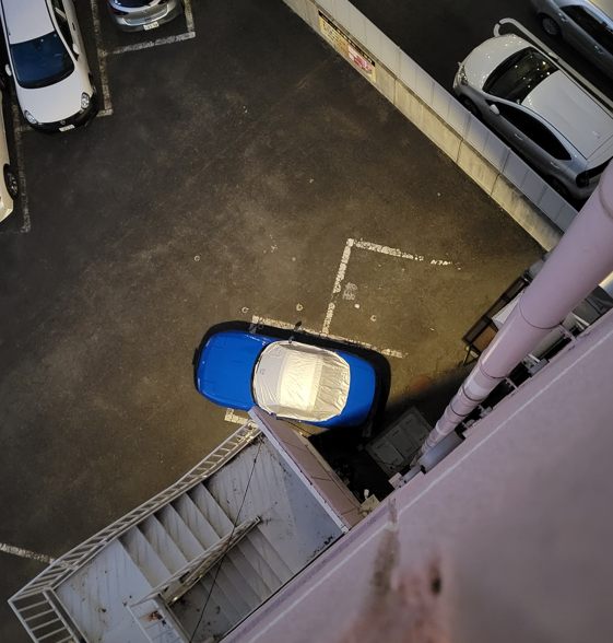 さて今日の宿に向かいます。駐車場が無いので近くのコインパーキングへ……これが不安なんですよね。今回ハーフカバーを持参、少しでも防犯対策を。そして駐車する位置を選びます、ドアパンチの可能性を下げるために。