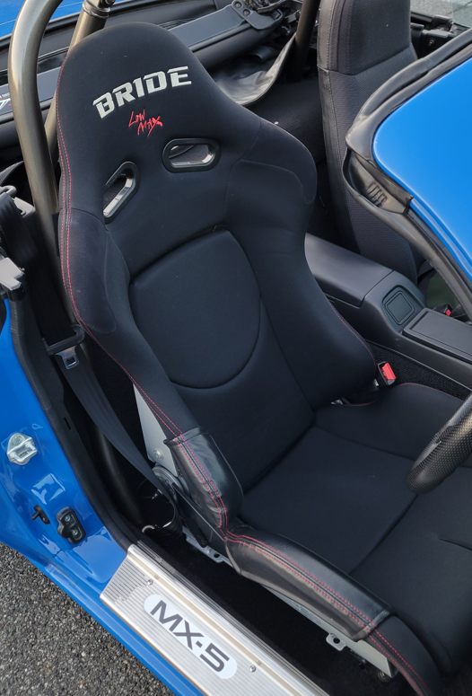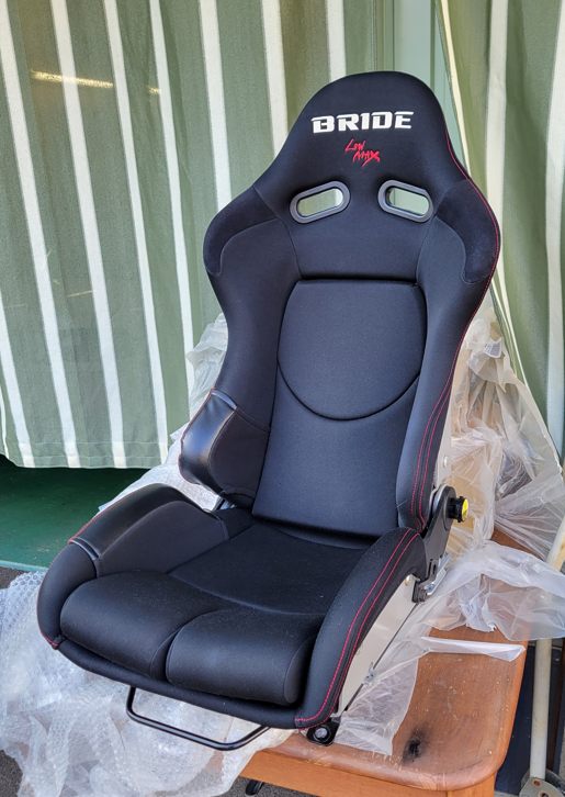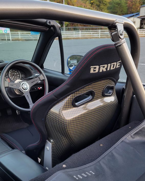 そのシートはリクライニング機構を持つブリッドのシートでした。過去に1度だけお客さんのクルマに装着されているのを見た記憶しかなく……フルバケより高価なので眼中に無かったんです(笑) ロドスタは狭いんだからフルバケでええじゃろ!みたいな。
