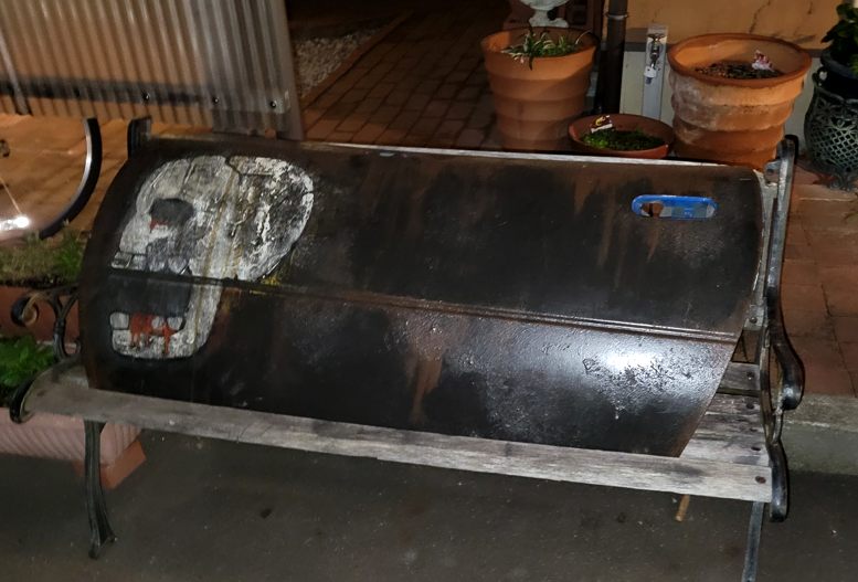 ガレージにあったドクロ号の遺品。このベンチが崩壊しそうなので……これをココに置くことにします。来店記念にこれを抱えてもらって……写真撮りますよ(微笑)