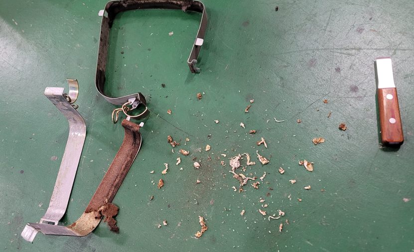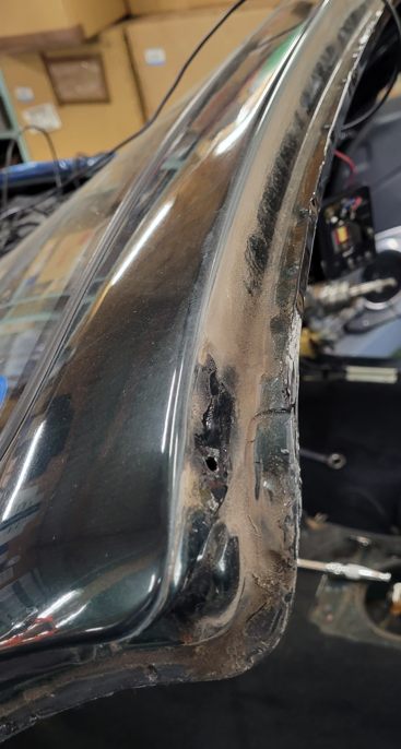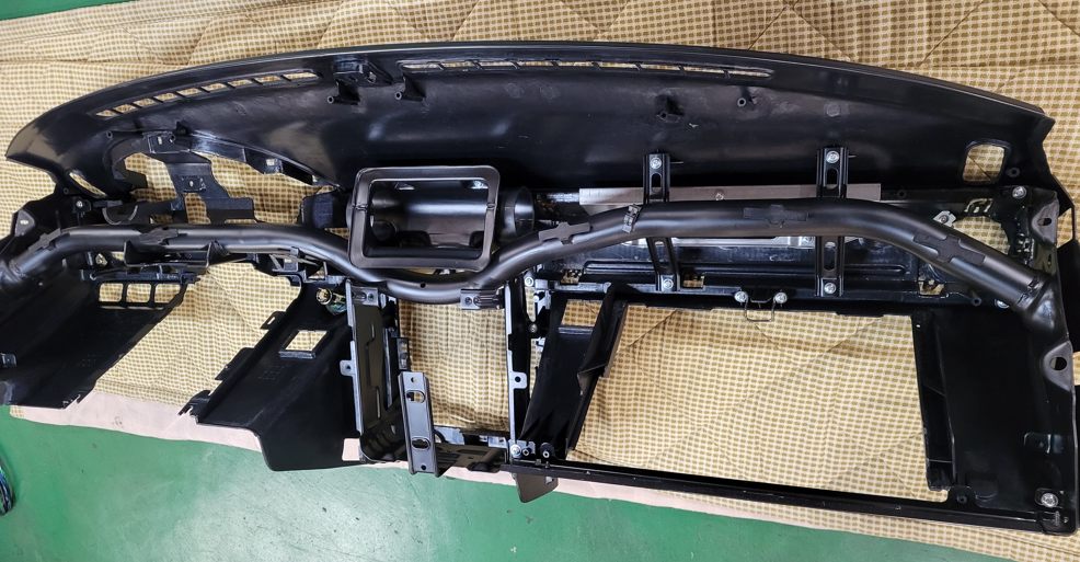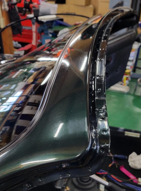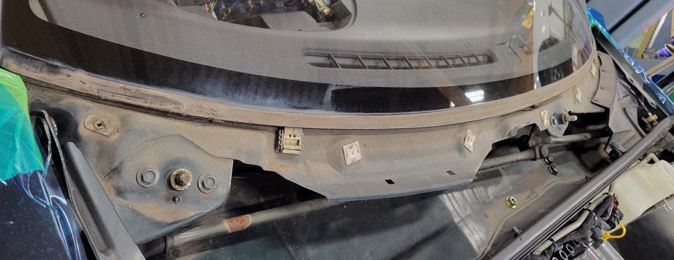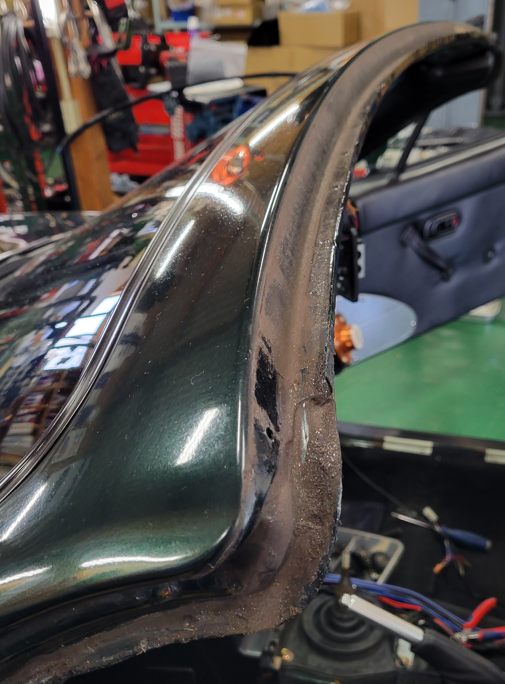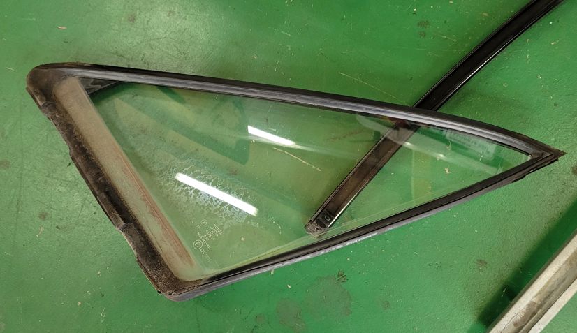 幌交換の時に当店ではここのAピラーのモールも同時交換しています。こんなに汚れているのは珍しいね。製鉄所の構内に入っていたんだけっけ?