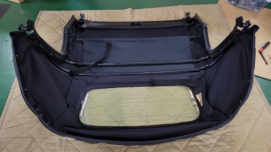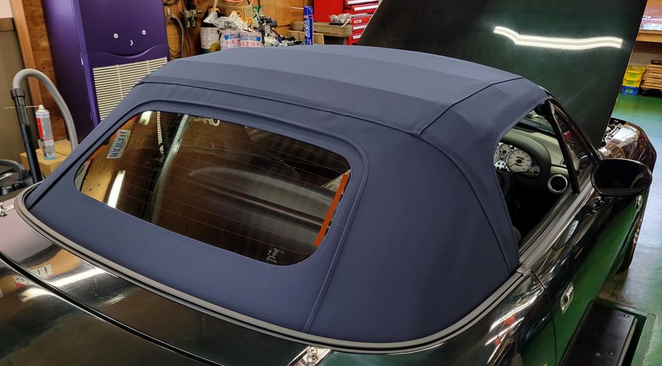 午後の作業で幌交換は仕上げを。週末の引き渡しまで馴染みを出します。この色は純正のクロスのダークブルーです、良い色だと思います。