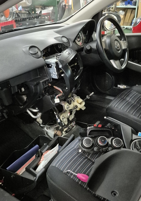 デミオね、奥さんが「ダッシュの中から変な音がする」と言うので探索……結果的にはこの画像のバラシは不要でした(笑) グローブボックスを外せばアクセスできた……ロドスタ以外は知らんしなぁ~ まさに無駄な時間。