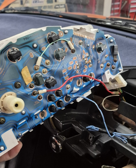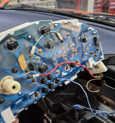 作業中のNA6ですがバラし始めた時、こんな感じでした。赤色はナビ用の車速取り出し線だと思ったのですが緑のジャンプさせている線の意味がわからず……とりあえず外して……しばらくして後、ダッシュの作業が終わったのでメーターを戻してエンジンを掛けると油圧計が動かない?