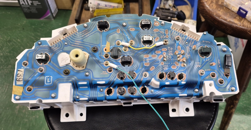 新しく線を引き直すと油圧計は動き出しました~ 基盤の不良カモですが目視ではわからず……35年の時が流れると予想を超えたエラーが出ますなぁ~ 「意味がわからん線」ではなく、以前の作業者さんが手直しした「必要な線」だったんですね、失礼しました(笑) てか、そんな不良は想像せんよ~