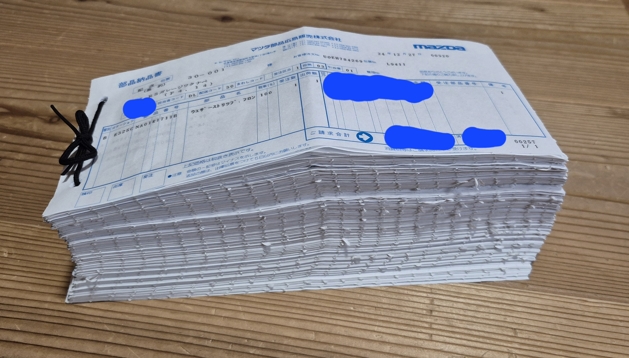 去年のマツダ部品の仕入れ伝票。1年分をまとめて保管しています。これで1200万円分です。店の売上は落ちているのにマツダ部品の仕入れの金額は増えています。なぜか? それはチューニングの仕事が減り、純正部品を使ったメンテの割合が増えたことと「部品代が上がった」ことじゃないかと。