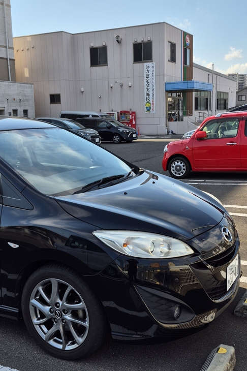 今日はスイム仲間を2人、飛び込みスタートの練習に連れて行くことになっていて……昨晩は飲み会だし、今日は日曜だからゆっくりしたかったけど9時過ぎにプレマシーを手洗い洗車! そしていつものプールへ……オネエサマ2名を乗せて児島のプールへ。