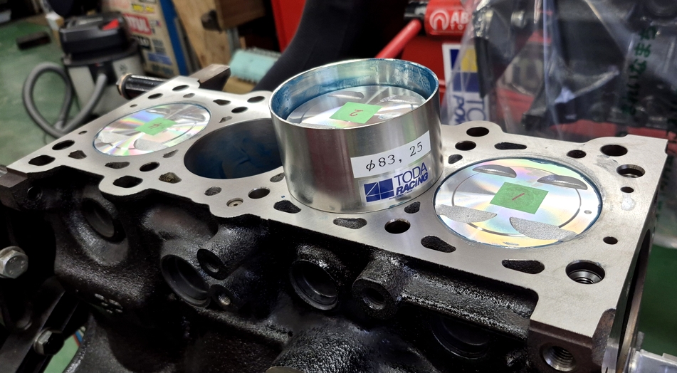 続いてエンジン製作を。BPね、0.25オーバーサイズピストンです。このトダレーシングのスライダーが最高なんですよ。このサイズは特注です。
