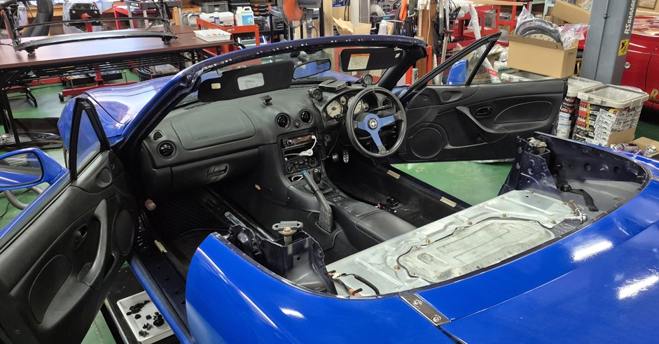 ガレージでは2台が同時進行で作業中~ このNBはエアコンを新調します。スペシャルエキマニが装着されていますがエアコン部品の脱着は可能です。