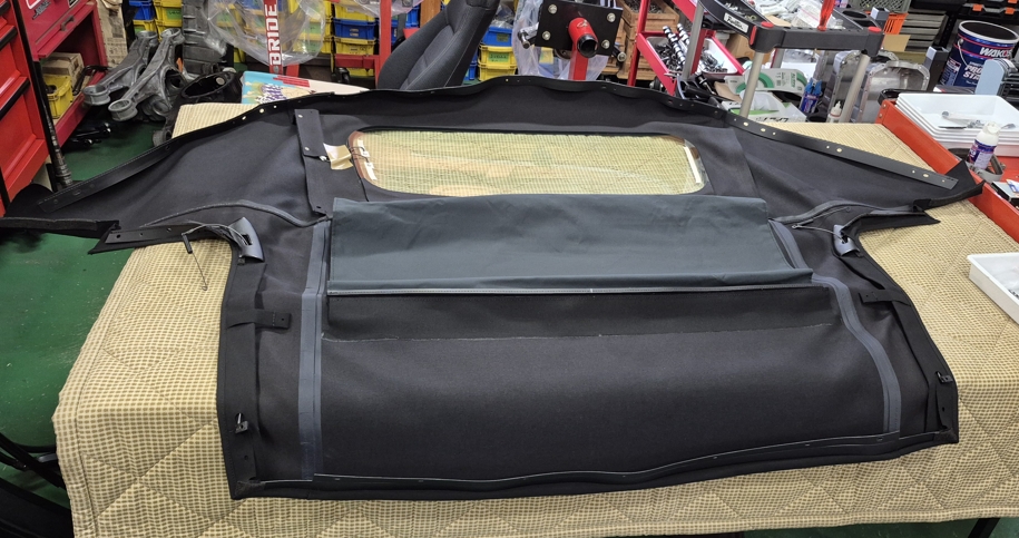 幌のガラスが落ちたと(笑) さすがにコレは……本来であれば10月にならないと作業時間は確保できなかったのですが部品待ちで作業が延期になった案件があり、しかも幌は在庫しているという。純正幌を在庫しているお店がどれだけあるかな? ほぼ無いんじゃない?(微笑)