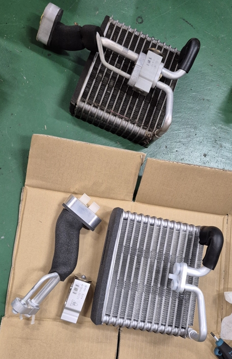 室内側にあるエバポレーター、3つの部品を連結するボルトはなぜか供給がないので再利用しますが……