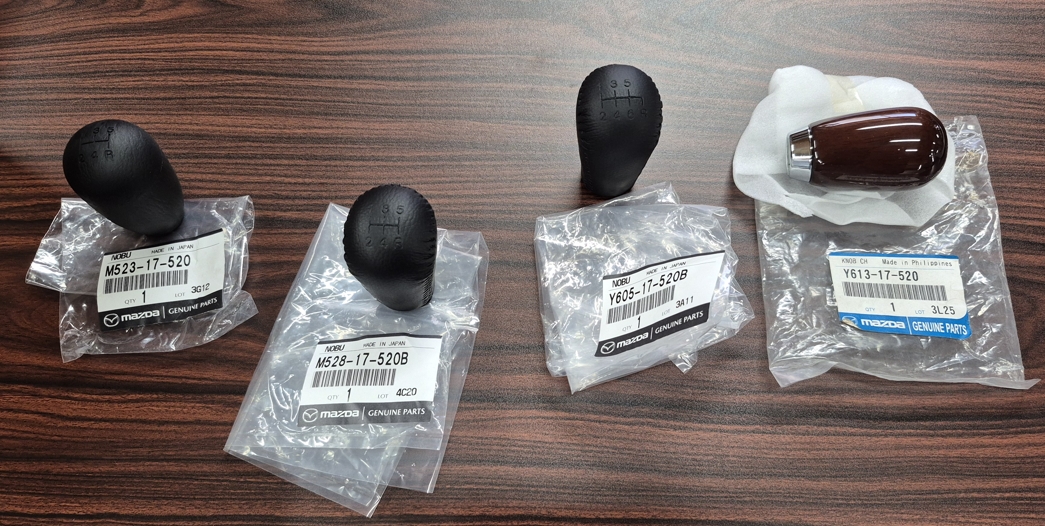 NBの純正のシフトノブ各種です。左から5速のウレタン、5速のレザー、6速のレザー、一番右が6速のウッドです。
