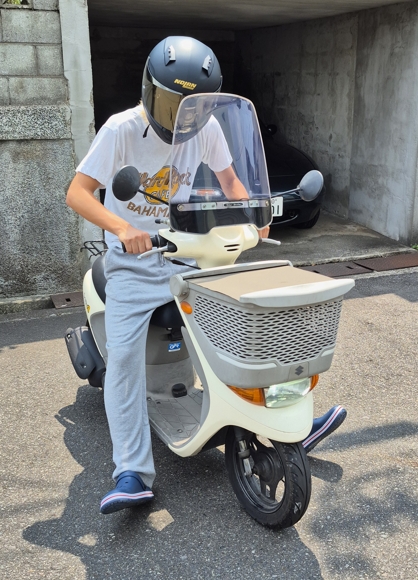 そのバイクにそのヘルメットは違和感が(笑) もともとオカンのスクーターですが数年前に降りて……ヒトに貸していた時もありますが出戻って来て……長男坊のアシには良いかも、本人も気に入ってるし。広島に軽トラで配達か~