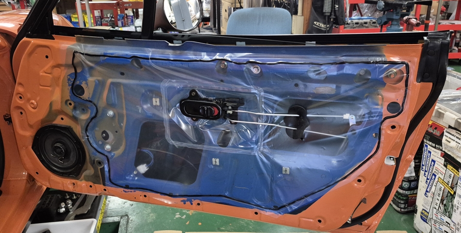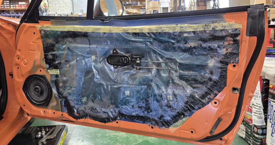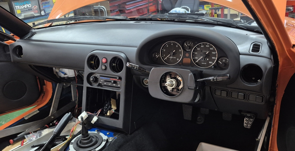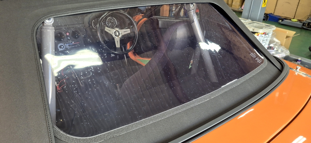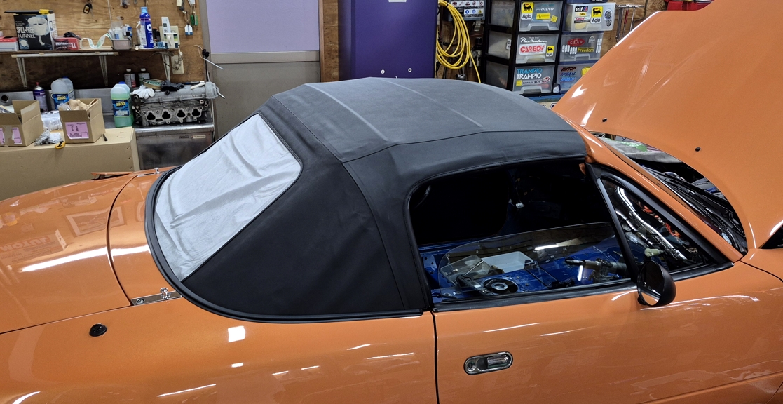 オレンジなNAの作業中ですが……室内側でやることはいくつかあって……作業の順番を考えつつ……幌を降ろしました。幌交換もあるので。