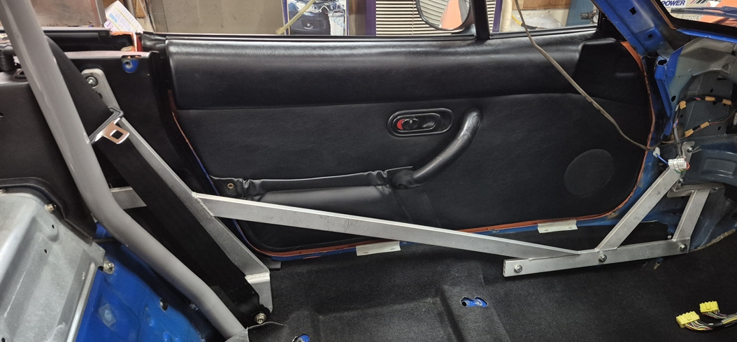 メインアーチはまだ床に固定しません。ドーダバーとか内装を固定してから……シートベルトも新調したので先にセット。ロールバーがあると入らないので。つまり組付ける順番を考えないとダメってことね。