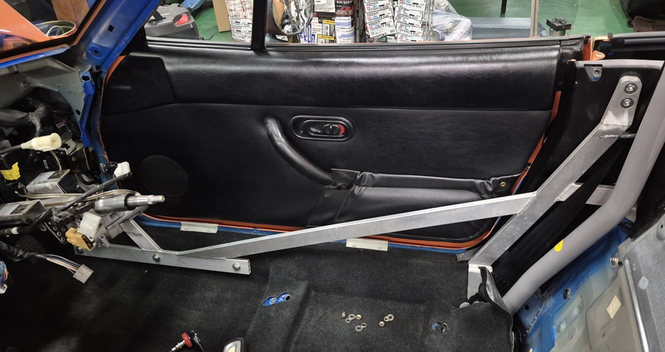 フロアマットも一旦外します、この先、ロールバー装着とかあるので取り外した方が作業しやすいかなと。
