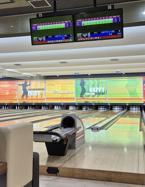 水曜の夜は空いているらしく……2レーン貸してくれました。1フレームごとにレーンをチェンジするアメリカン方式で投げることに!