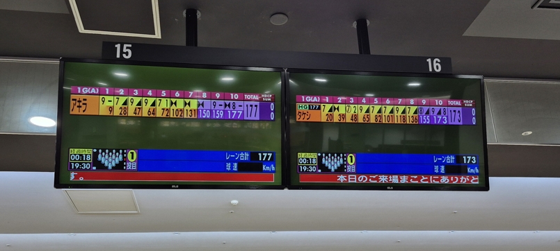 「タケシ」の名前の上に「HG177」とありますがこれが過去ベスト、このボーリング場の会員になると自己ベストが表示されるのです。 本日、半年ブリくらいに更新、178ですが(笑) たった1ピン~
