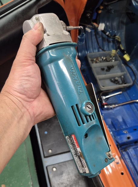 ロールバーを装着する時に必要なアングルドリル。もう何年使ってるかな?20年くらいかも。小屋の時代だったと思います。2万円くらいなんですけどね、当時は買うのに勇気が必要だったんですよ!ホントに。2万円の道具代に躊躇していたんです、今は……(笑)
