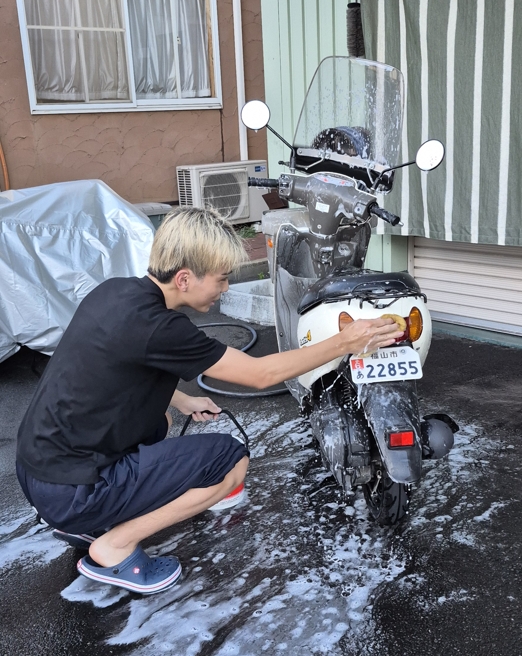 不要になったオカンの原付をあてがうと思いのほか、気に入った模様。自ら洗車していました。広島に持って行って普段のアシにするらしく。原チャリは便利だよね~