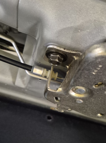 トランクが開きにくいと……仕組みは単純なのでキャッチに問題あるのかな?と見てみると……ワイヤーがきちんと掛かっていません(画像ではわかりにくいですがカチっとハマっていない、位置も違う。