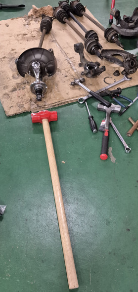 ドライブシャフト抜きです、最後の1本が抜けねぇ~ 赤いハンマーは3キロ……柄が長いので的に当てるのが難しいんですよ~ 50発は殴ったけど今日は無理……腰を痛めたかも知れない(苦笑)