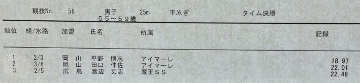 12時過ぎにまずは25Mの自由形(クロール)から。更衣室で屈伸はした、いじょ(笑) 水に全く入らずにいきなり本番か~ 緊張するな~ と言うことでスタート! 25Mのクロールは息継ぎしません、耐えるのです。