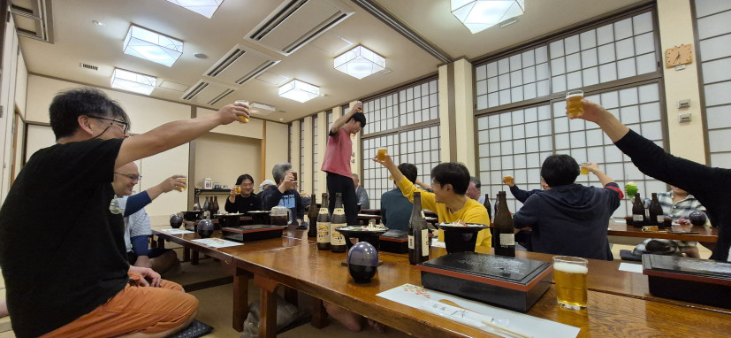 いつもの宿で温泉からの宴会! ガレロス店主の音頭でスタート!